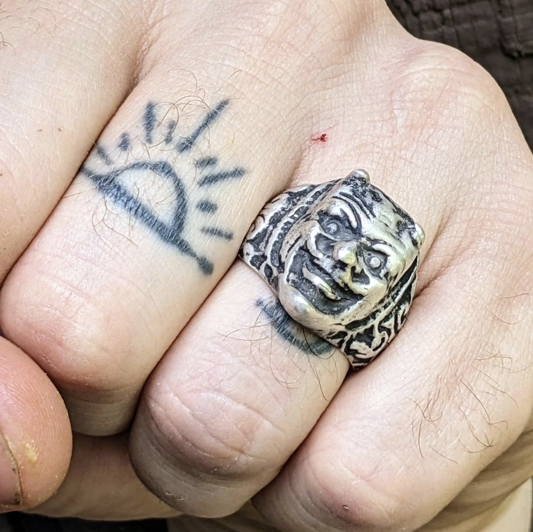 This ring is a reproduction, molded from an early 20th century European piece, and has all the hallmarks of something more sinister. Unfortunately I do not know the true origin of this ring- The advertisement shown in this listing is entirely a work of fiction that was created for this project. Available in sterling silver and yellow brass, sizes 7-13